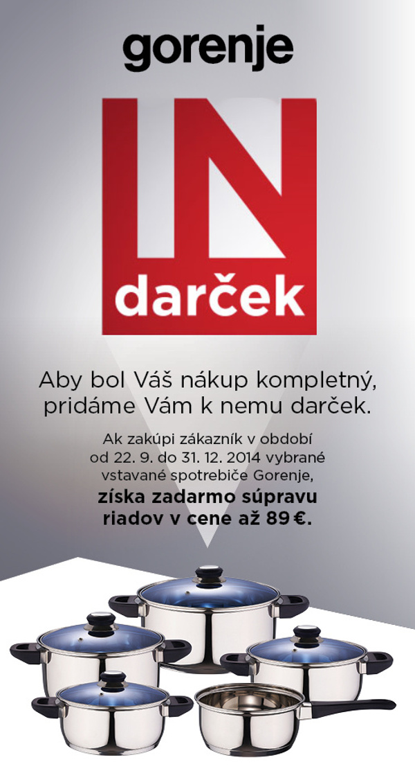 Každý zákazník, ktorý v období od 22. 9. do 31. 12. 2014 zakúpi vybrané vstavané spotrebiče Gorenje, získa zadarmo súpravu riadov v cene až 89 €. Vyberte si vlastnú kombináciu: